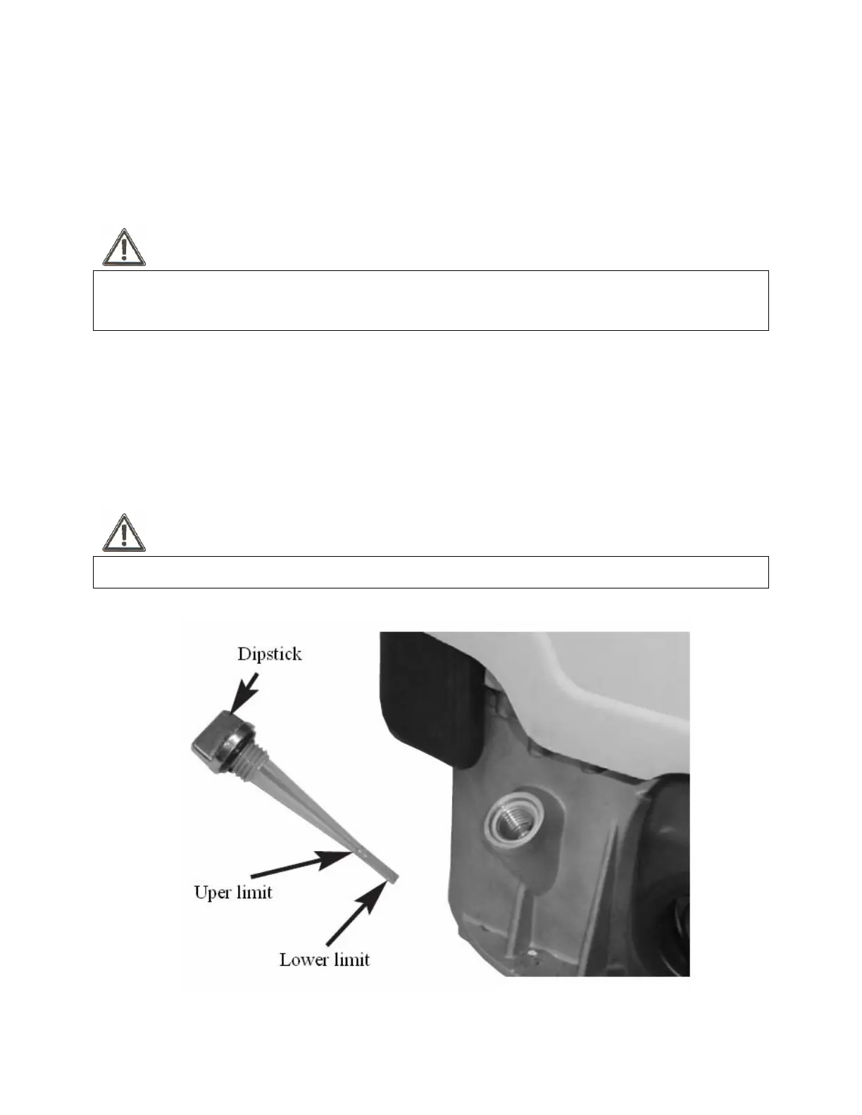 the dipstick, add oil slowly and recheck until oil level reaches upper limit of dipstick. Do not overfill.