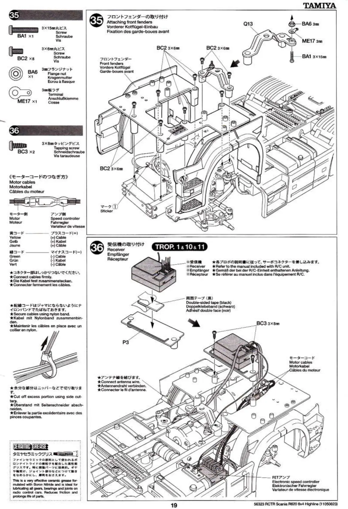 Tamiya 56323 - Front Fender Installation; Front Fender Component Identification; Receiver Installation; Motor Cable Connections