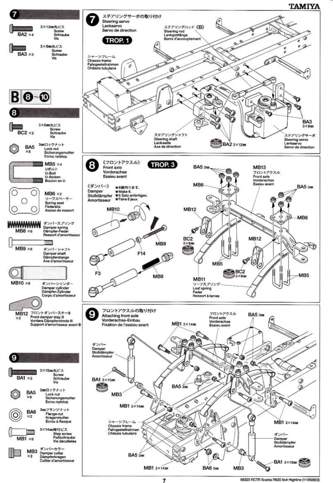 Tamiya 56323 - Steering Servo Installation; Steering Rod B Identification; Front Axle Assembly; Damper Assembly