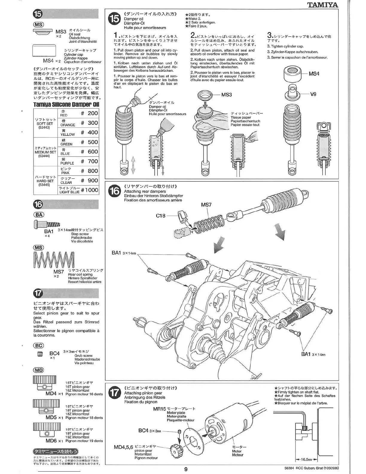 Tamiya Subaru Brat - Damper and Motor Assembly; Damper Oil Setting; Attaching Rear Dampers; Attaching Pinion Gear