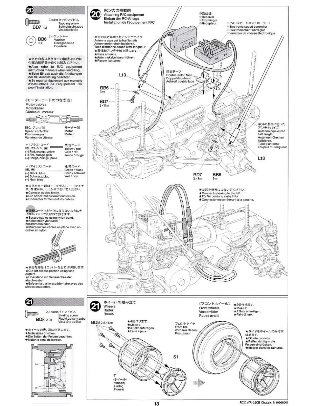 Tamiya WR-02CB - R;C Equipment and Wheel Assembly; Attaching R;C Equipment; Front Wheels Assembly; Motor Code Connection