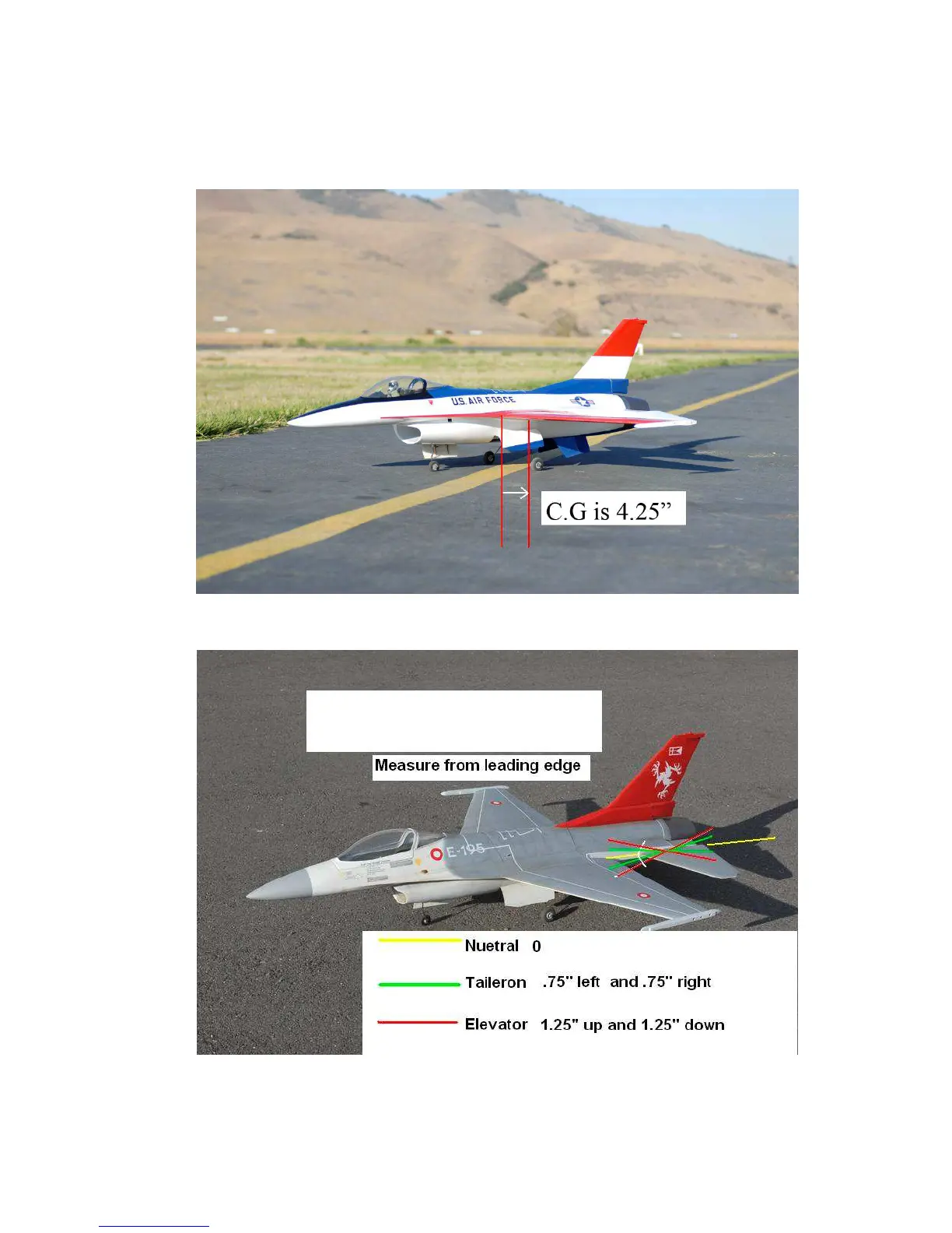 Tamjets F-16 EDF - Step 14 C.G. and Control Throws; C.G. is 4.25 back from wing leading edge at the wing root; Taileron.75 left and.75 right; Elevator 1.25 up and 1.25 down
