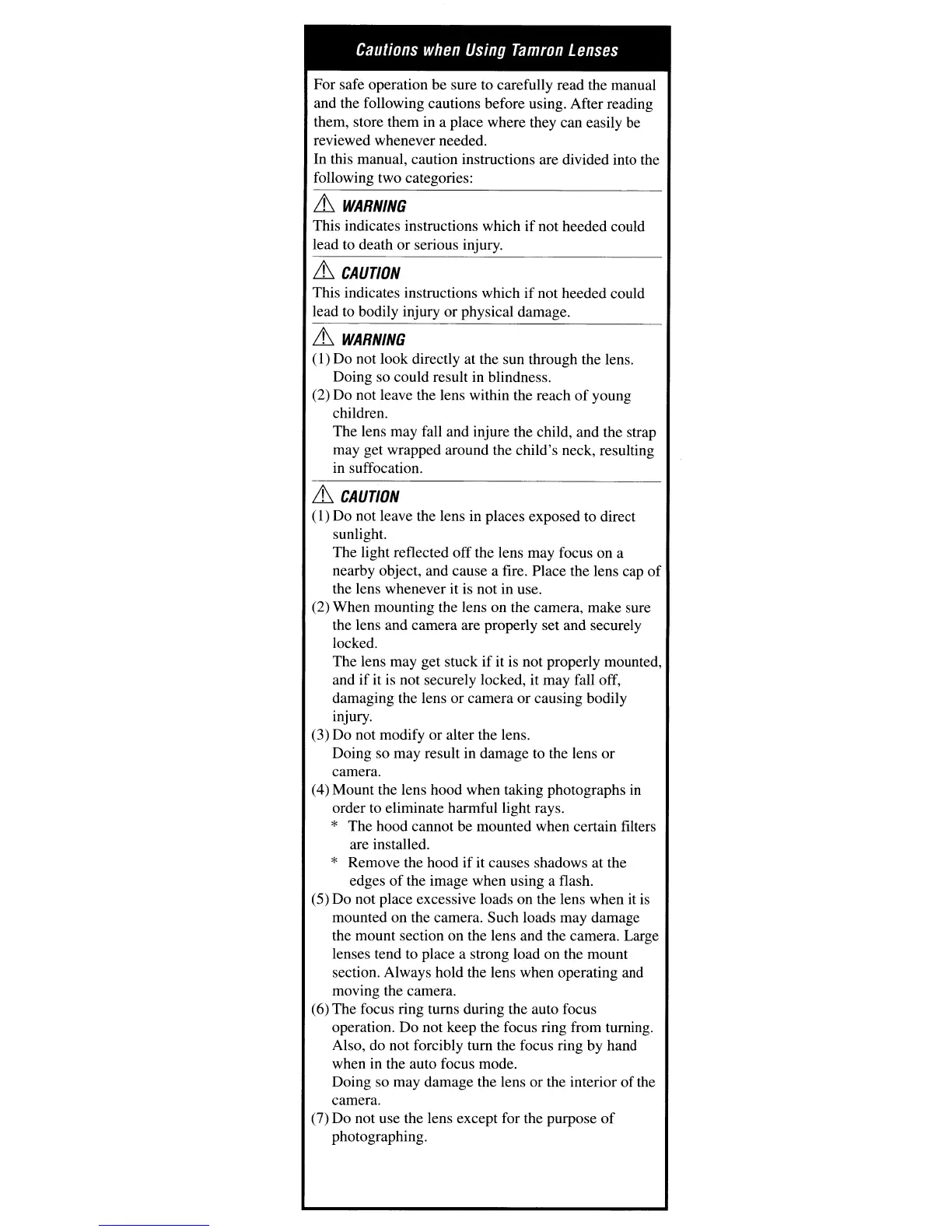 (7) Do not use the lens except for the purpose