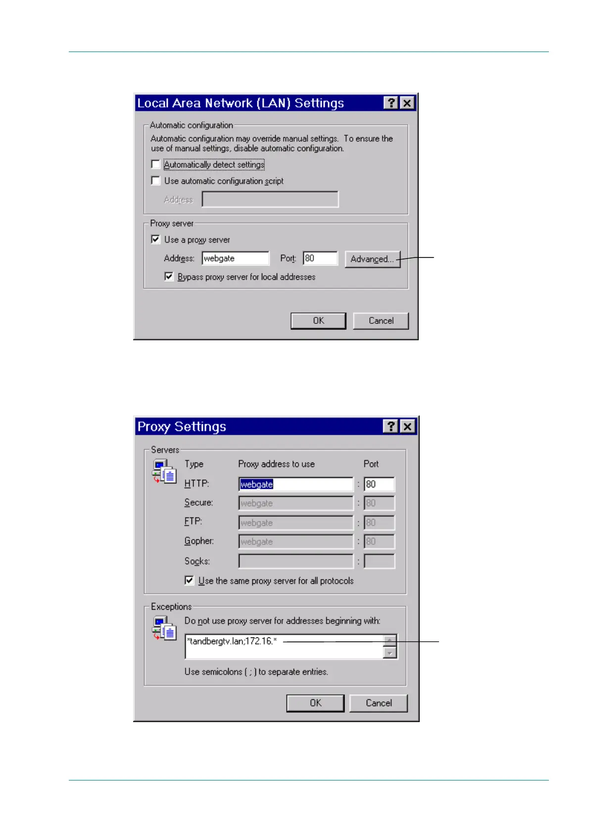 7. Click Advanced to open the Proxy Settings dialog box (see