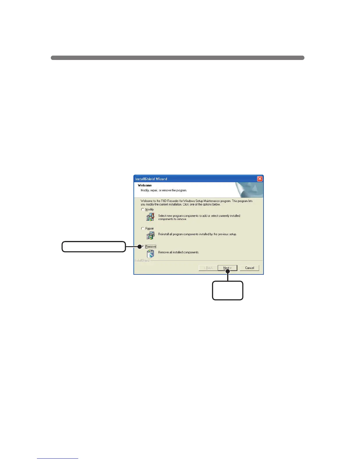 3.The [Install Shield Wizard] will appear. Check [Remove], and click