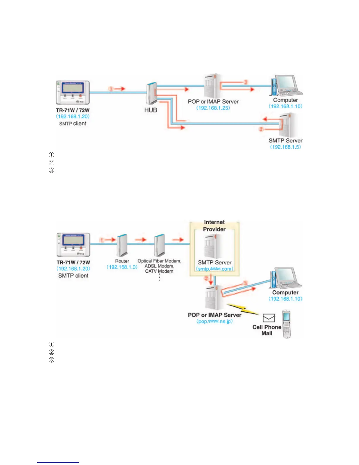 The TR-7W accesses the SMTP server and sends mail.