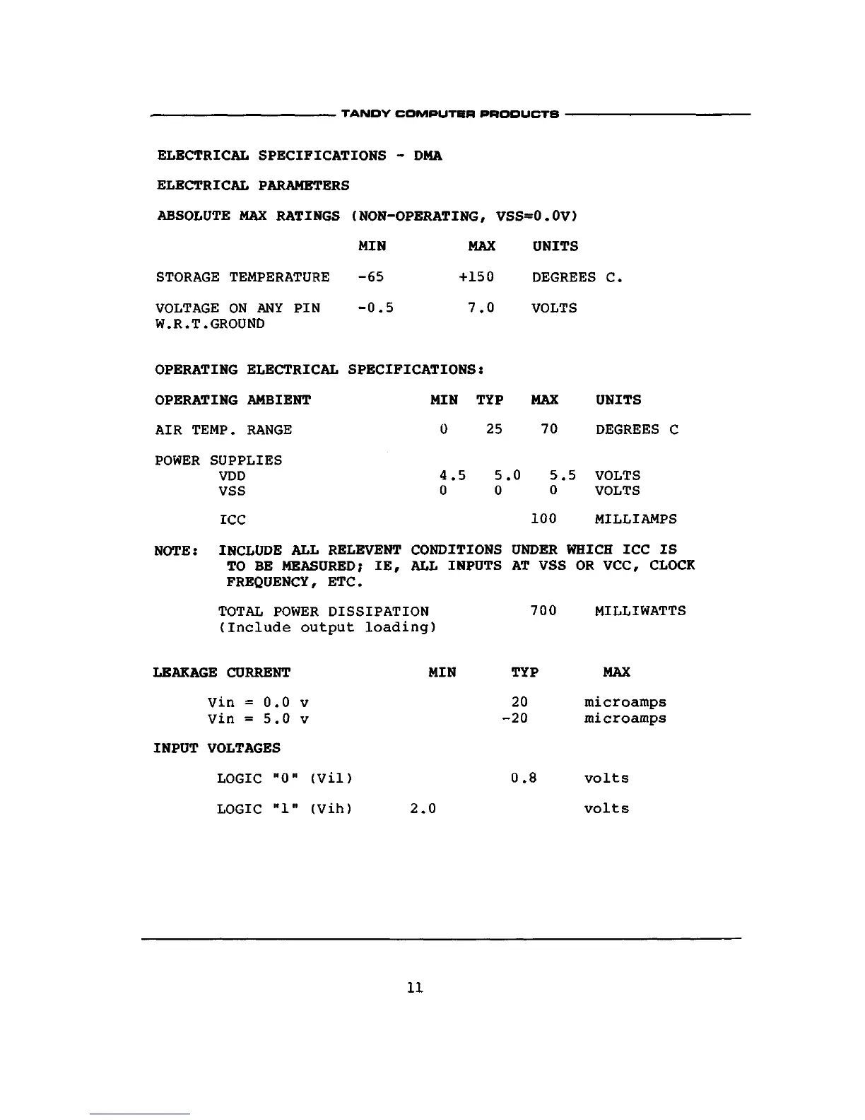Tandy 1000 HX - Electrical Specifications; ABSOLUTE MAX RATINGS; OPERATING ELECTRICAL SPECIFICATIONS
