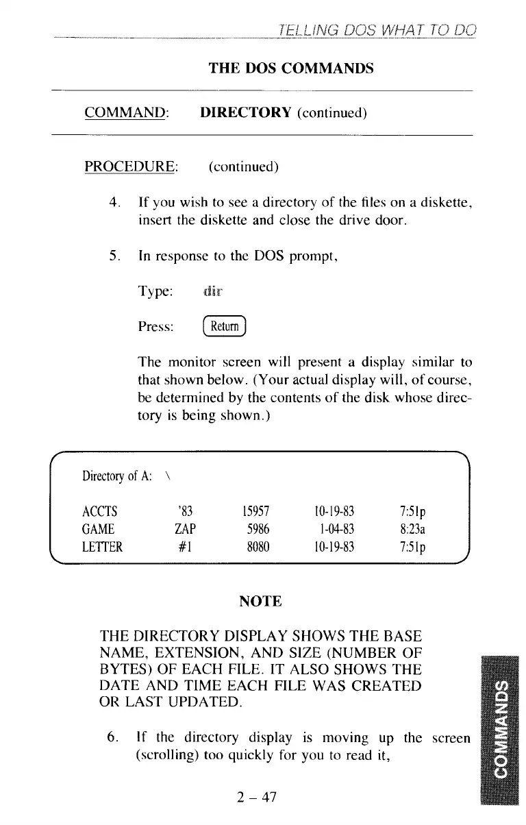 THE DIRECTORY DISPLAY SHOWS THE BASE