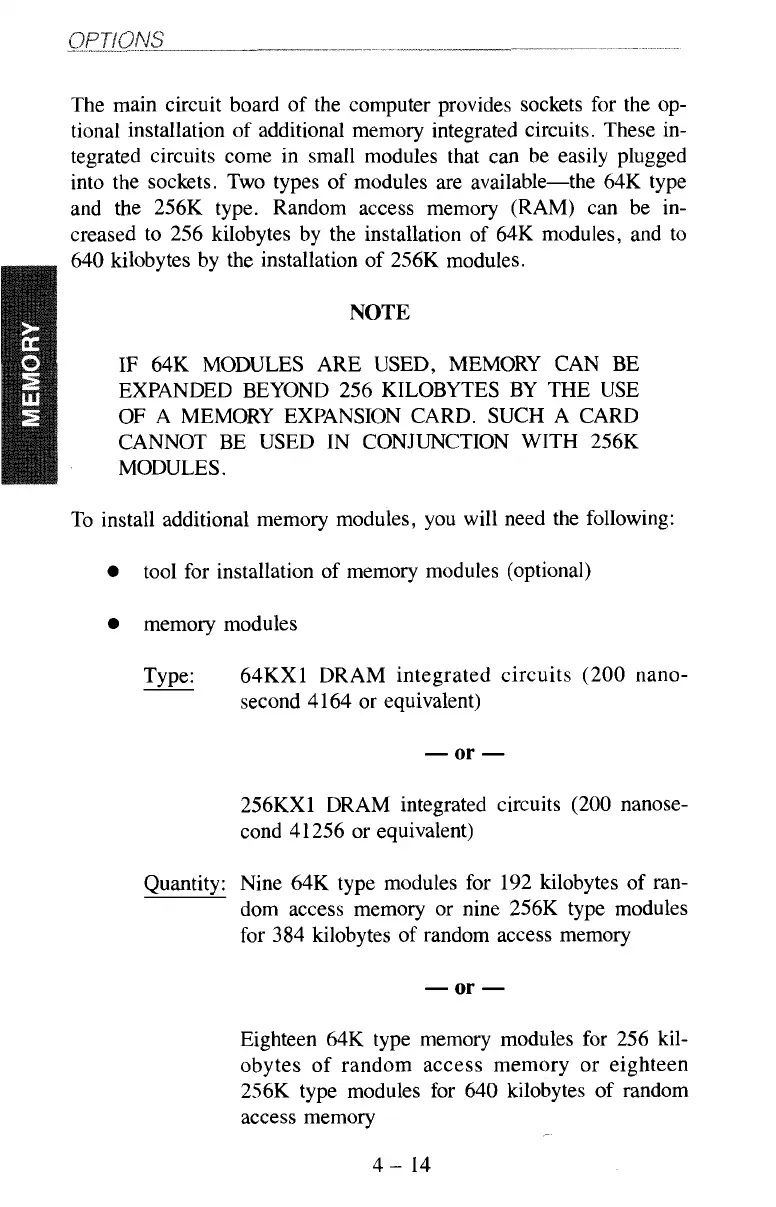 creased to 256 kilobytes by the installation of 64K modules, and to