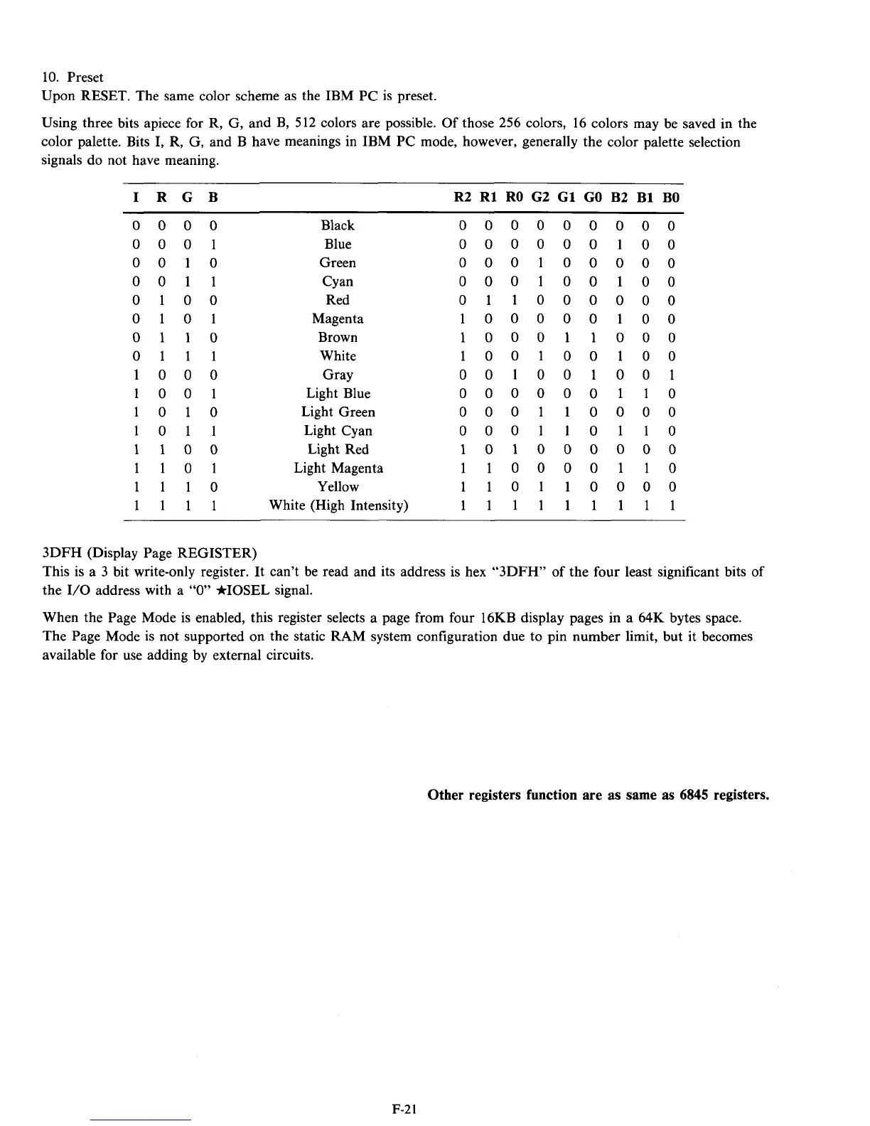 color palette. Bits I, R, G, and B have meanings in IBM PC mode, however, generally the color palette selection