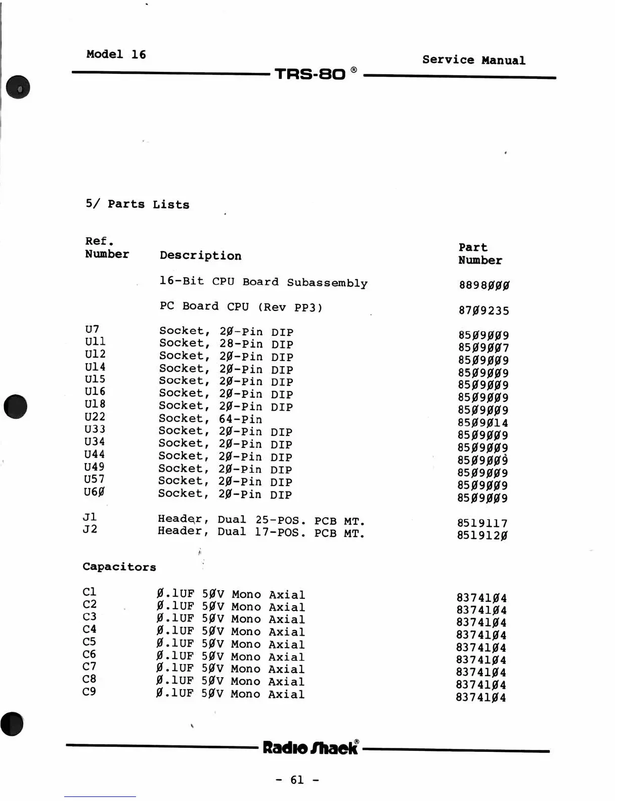 Tandy TRS-80 Model 16 - Component Parts Lists; 16-Bit CPU Board Subassembly Parts