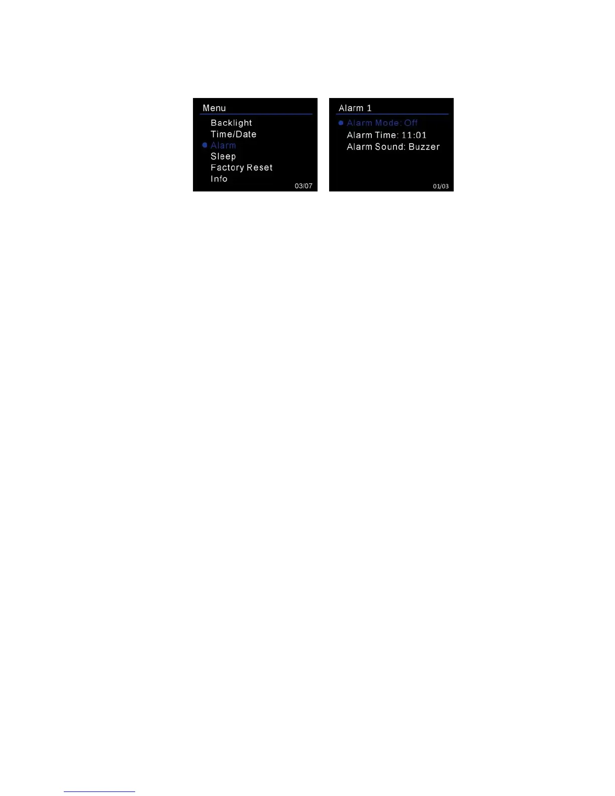 Alarmzeit: Die Alarmzeit kann mit den Prozeduren eingestellt werden, die der Uhrzeit