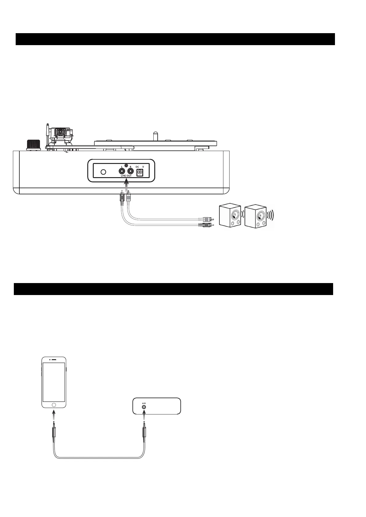 Requires AUX cables (not included). Use to connect the turntable to an external devices like phone, tablets, mp3 player.