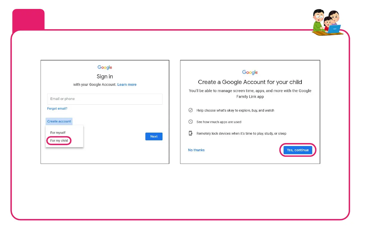 will be linked with a parent’s Google Account in the next step. Be sure to enter your kid’s real age! If the age