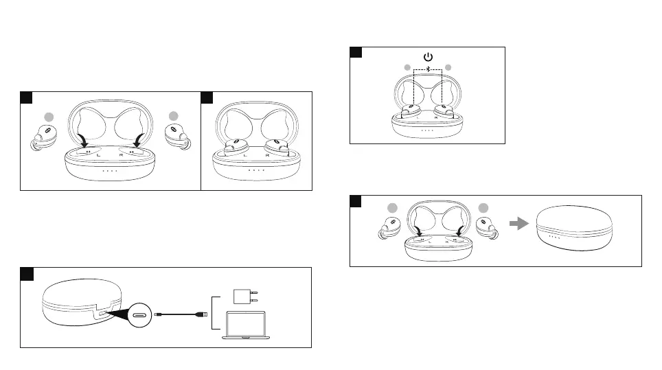 1. イヤフォンをL(左)、R(右)のマークに従ってそれぞれ充電ケースに入れます(図. 5)。