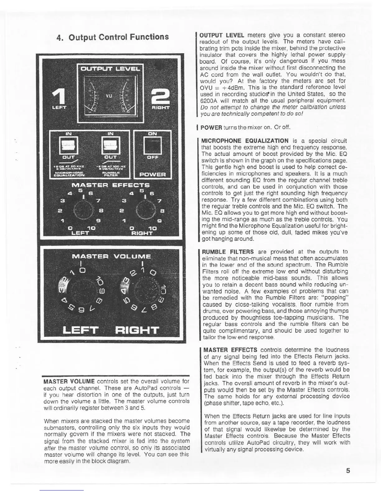 Tapco 6200A - Output Control Functions; Master Volume; Output Level; Microphone Equalization