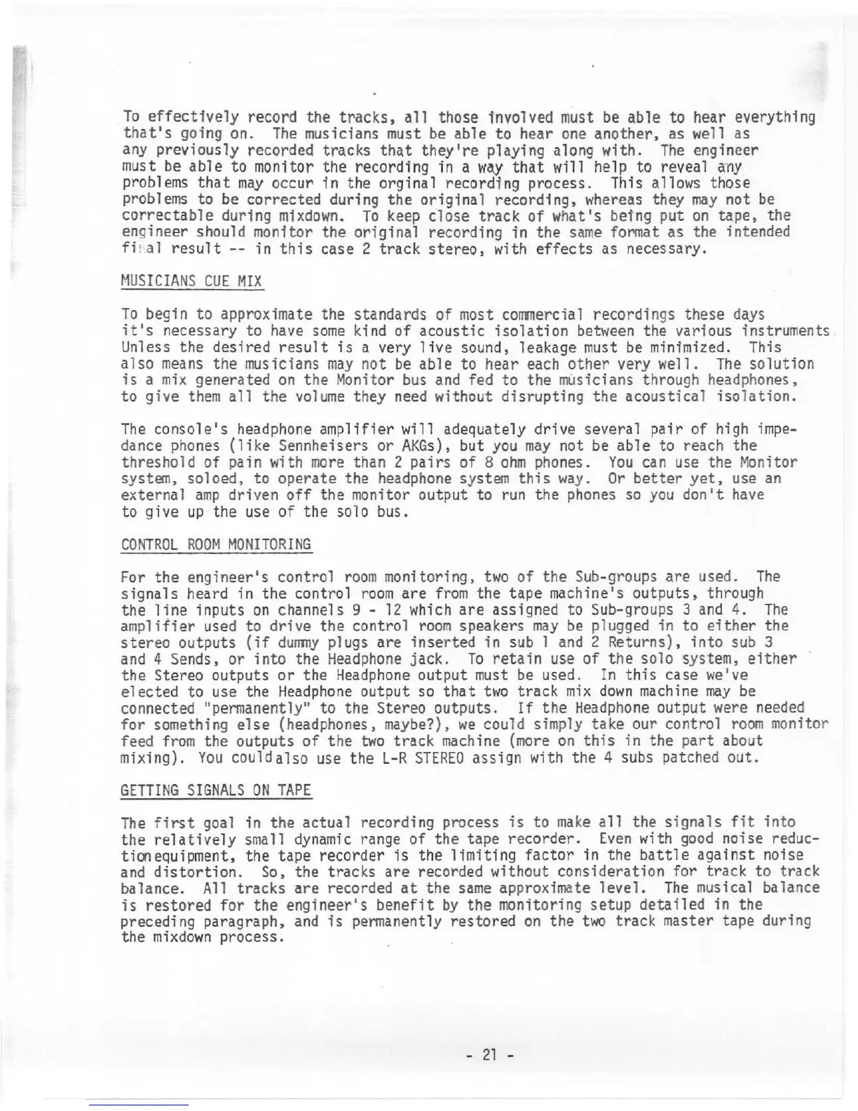 Tapco C-12 - RECORDING PROCESS AND MONITORING STRATEGIES; Musicians Cue Mix Generation; Control Room Monitoring Setup