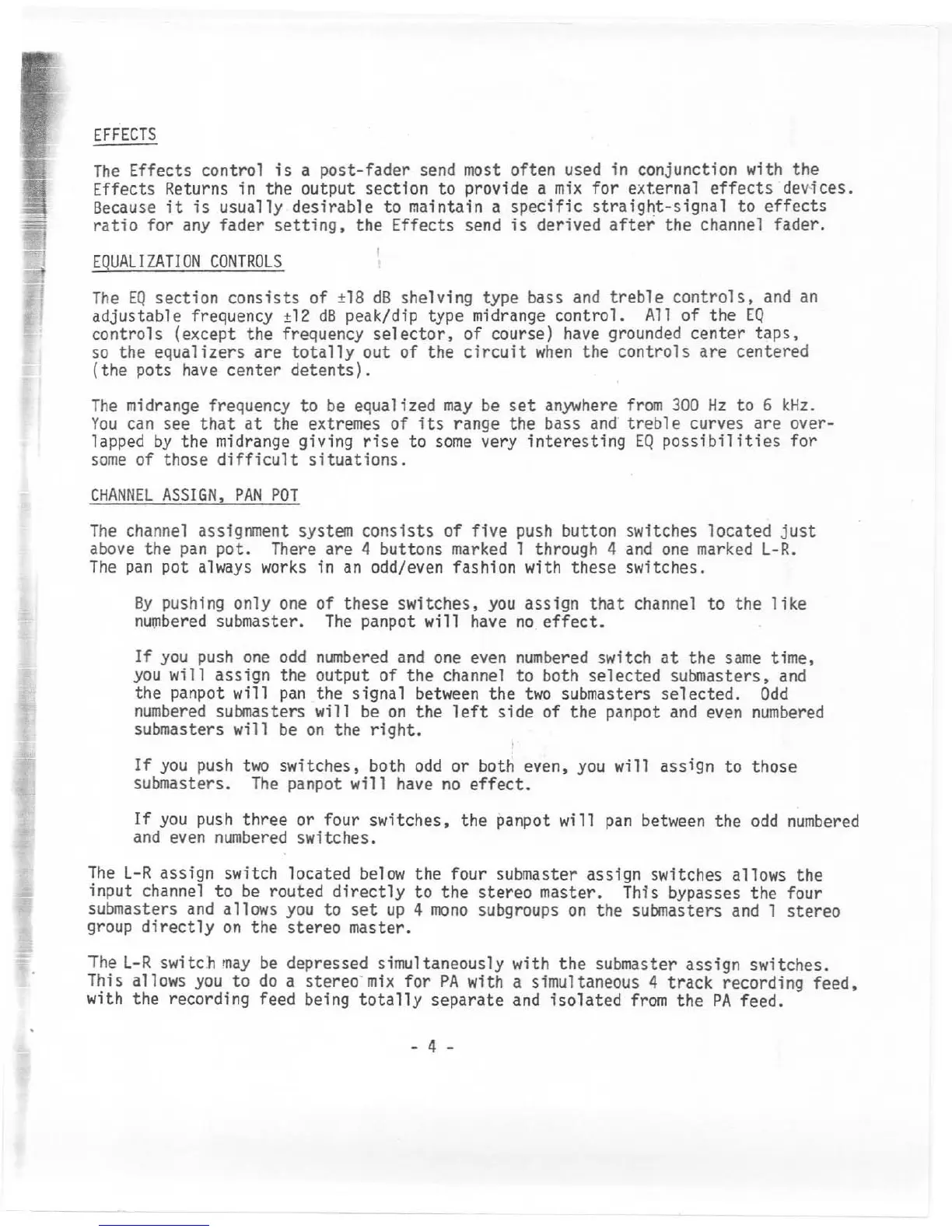 Tapco C-12 - EFFECTS, EQUALIZATION, AND CHANNEL ASSIGNMENT; Equalization Control Details; Channel Assignment and Pan Pot Operation
