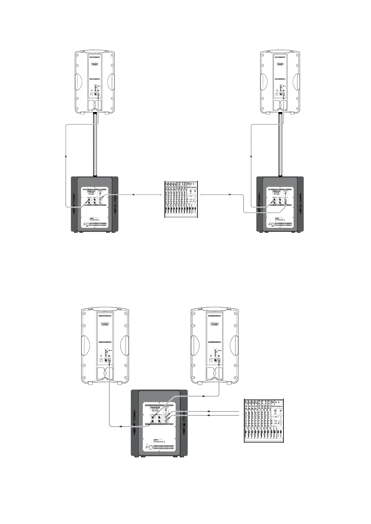 The left and right line-level outputs from a mixer feed the inputs of a TH-18s active subwoofer. The full-range line-