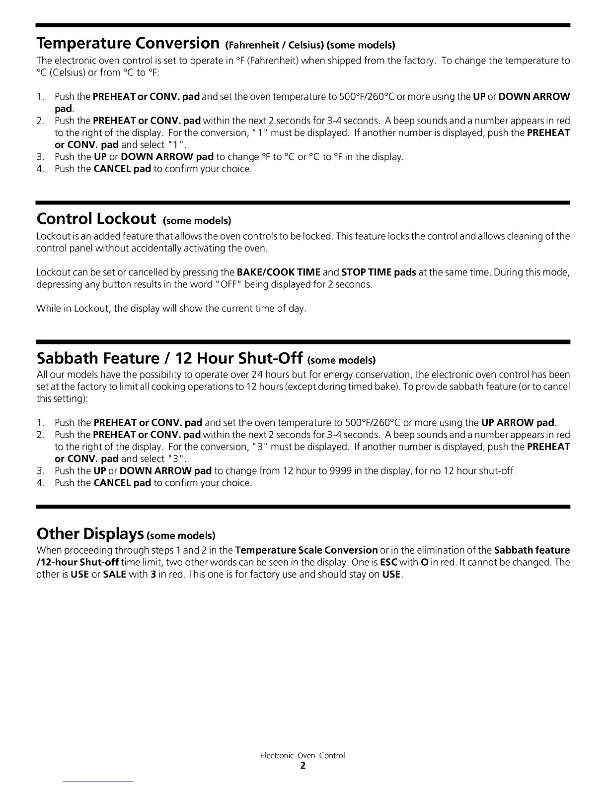 set at the factory to limit all cooking operations to 12 hours (except during timed bake). To provide sabbath feature (or to cancel
