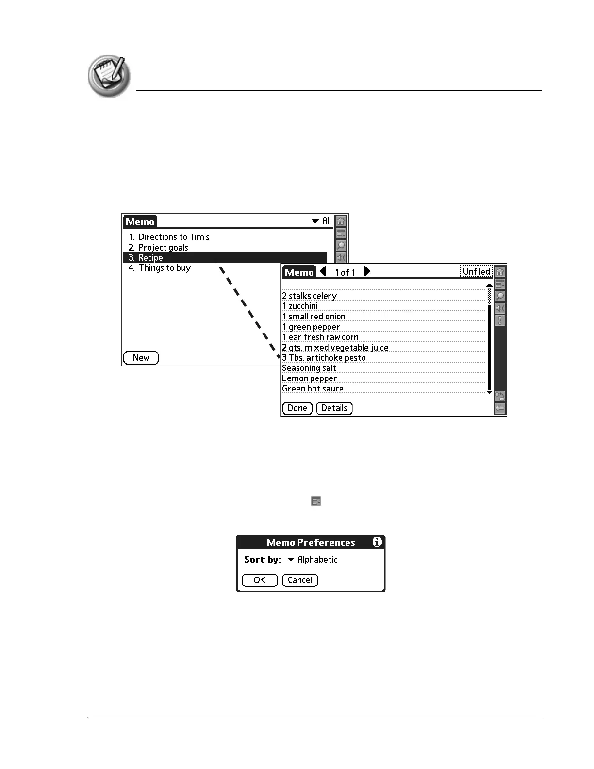 The Memo List displays the first line of a memo. This makes it easy to locate