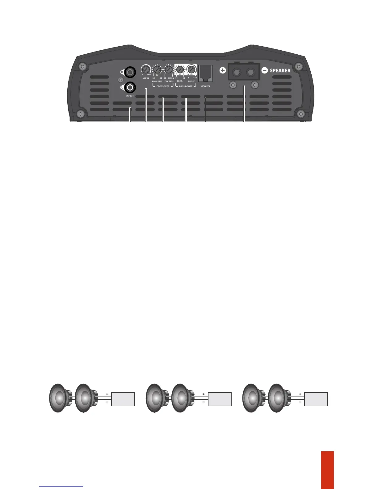 6 - SPEAKER: Output (positive and negative) to transducers connection (speakers). Follow the polarity