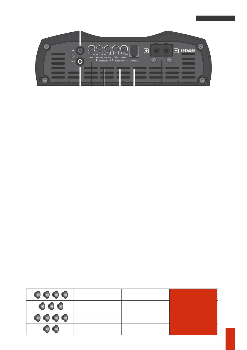 7 - SPEAKER: Saída (positivo e negativo) para a conexão dos transdutores (alto-falantes). Seguir a
