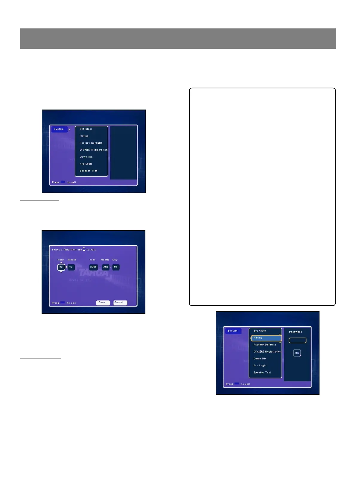 (System ---> Set Clock, Rating, Factory Defaults, DivX (R)