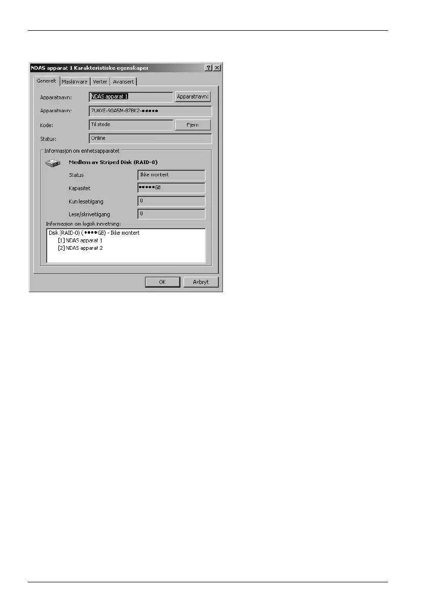 NDAS 500 eSATA, den tilkoblede harddiskstasjonen og brukerne som har opprettet