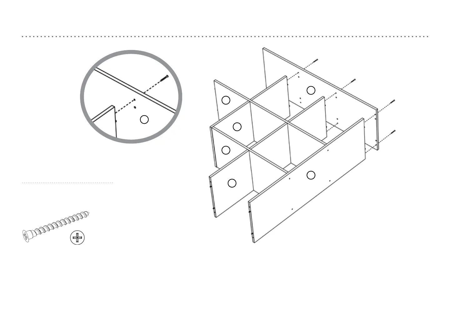 2. Secure side panel (A) to bottom panel and both dividers using six assembly screws.
