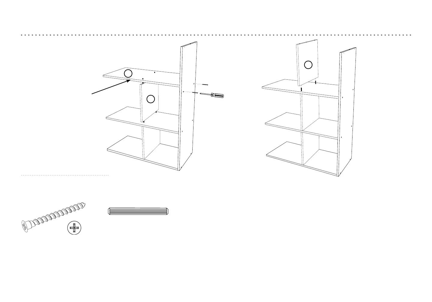 3. Attach horizontal divider down over dowels. Be sure to assemble with all nished edges to the front.