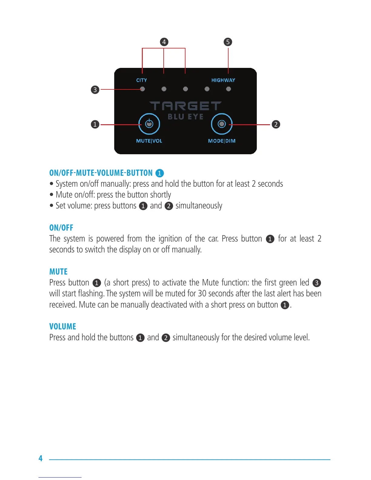 Press button ❶ (a short press) to activate the Mute function: the first green led ❸