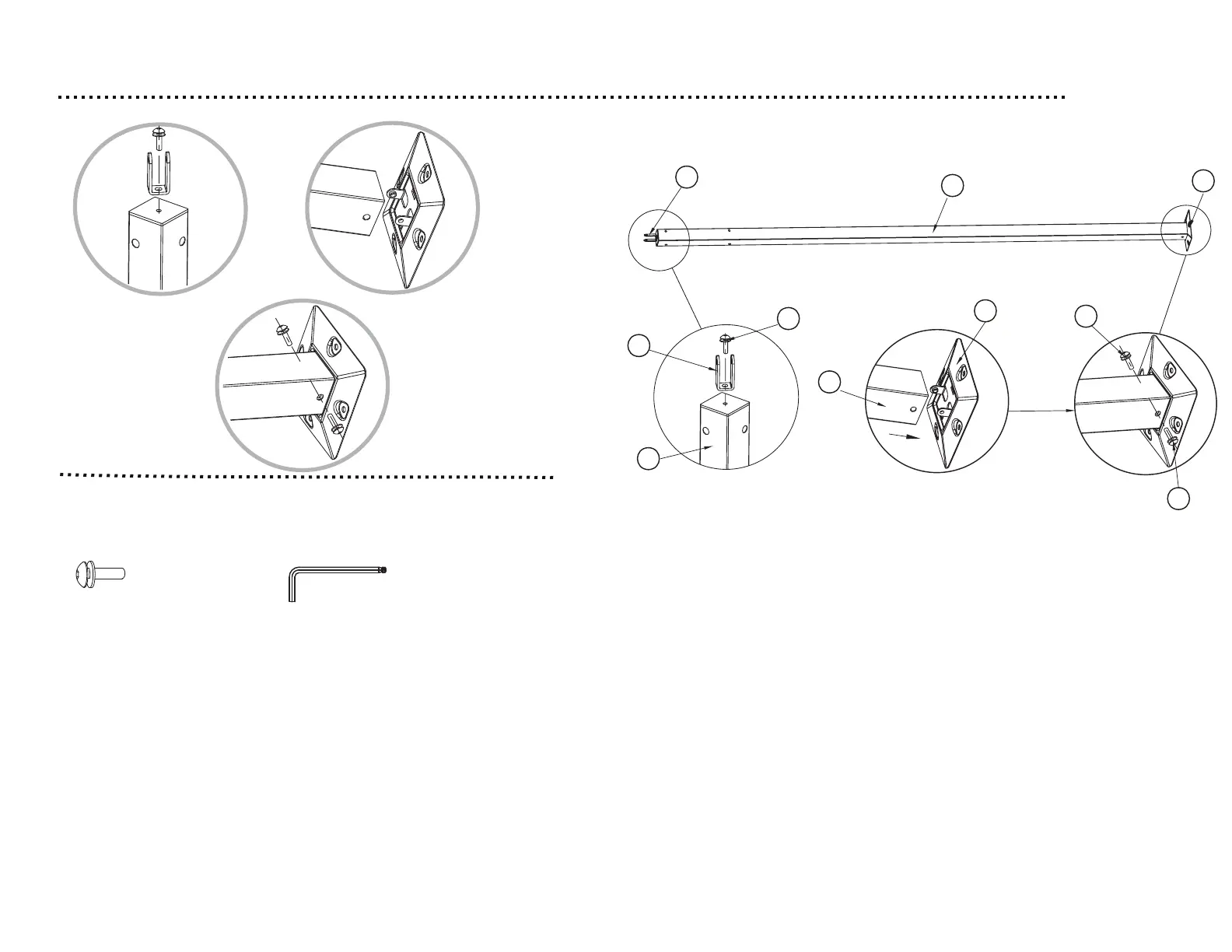 1. Attach the U-shaped part 1 (G) to the post leg (A), secure with M6*15mm bolt with washer (O) using the allen wrench (T).