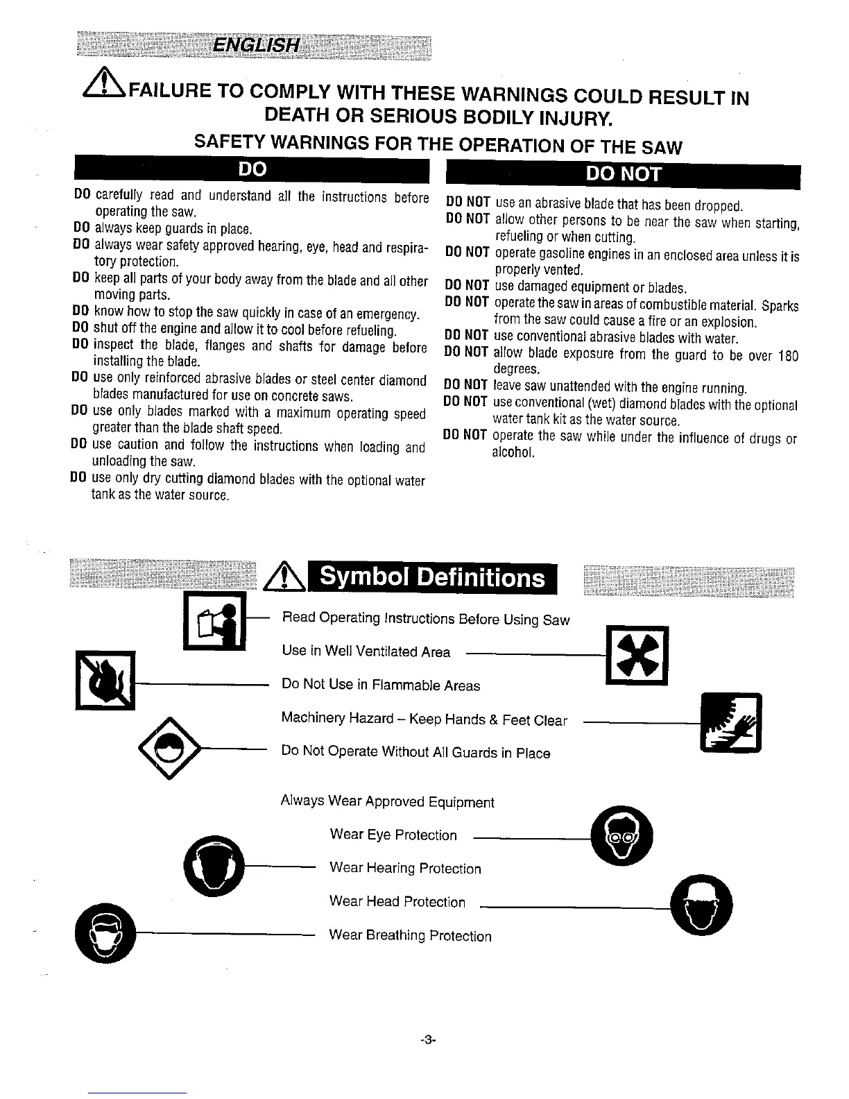 Target MINI CON II - English Section: Operation; Safety Warnings for Saw Operation; Symbol Definitions