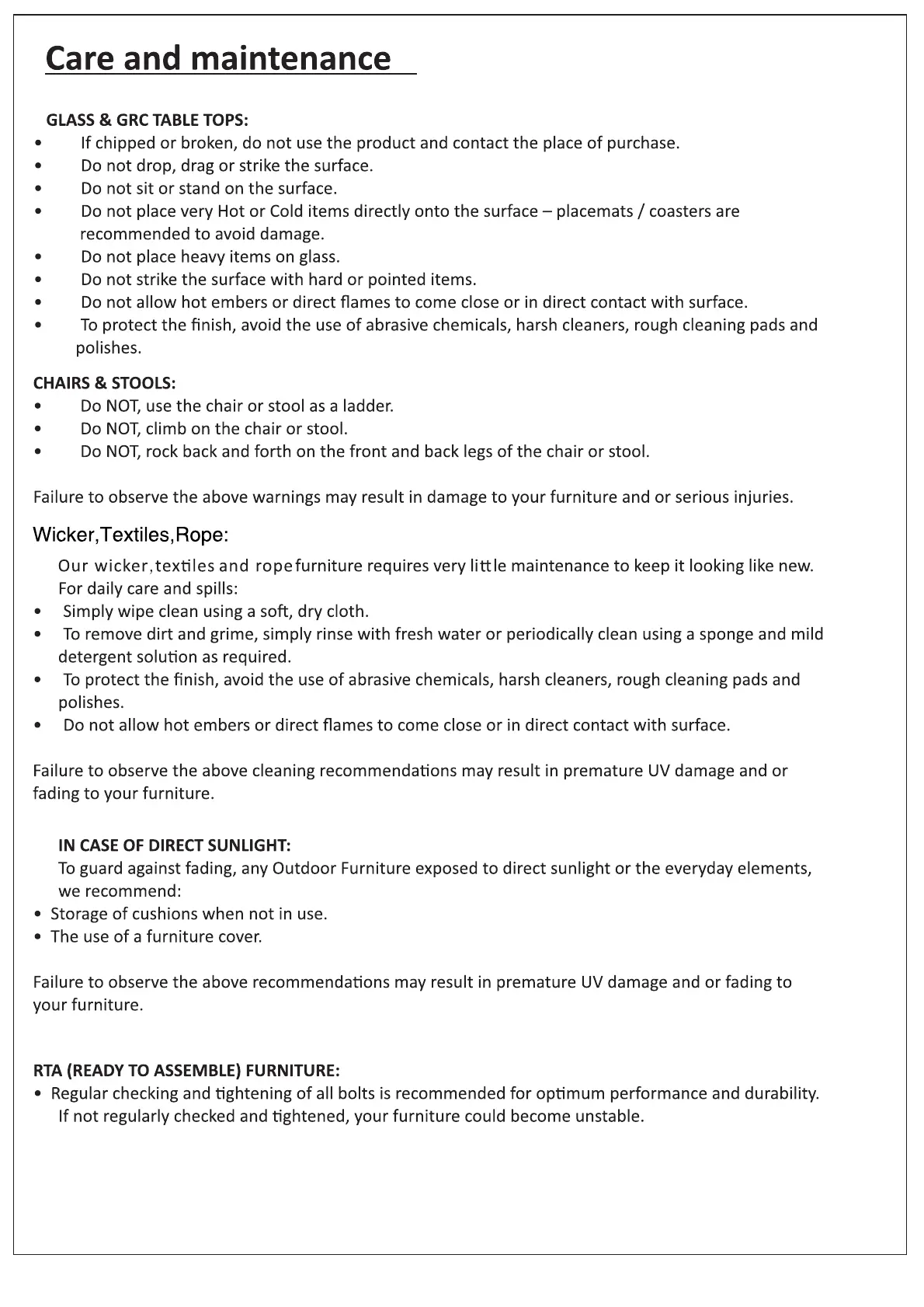 Target MYKONOS - Care and Maintenance; Glass & GRC Table Tops; Chairs & Stools; Wicker, Textiles, Rope