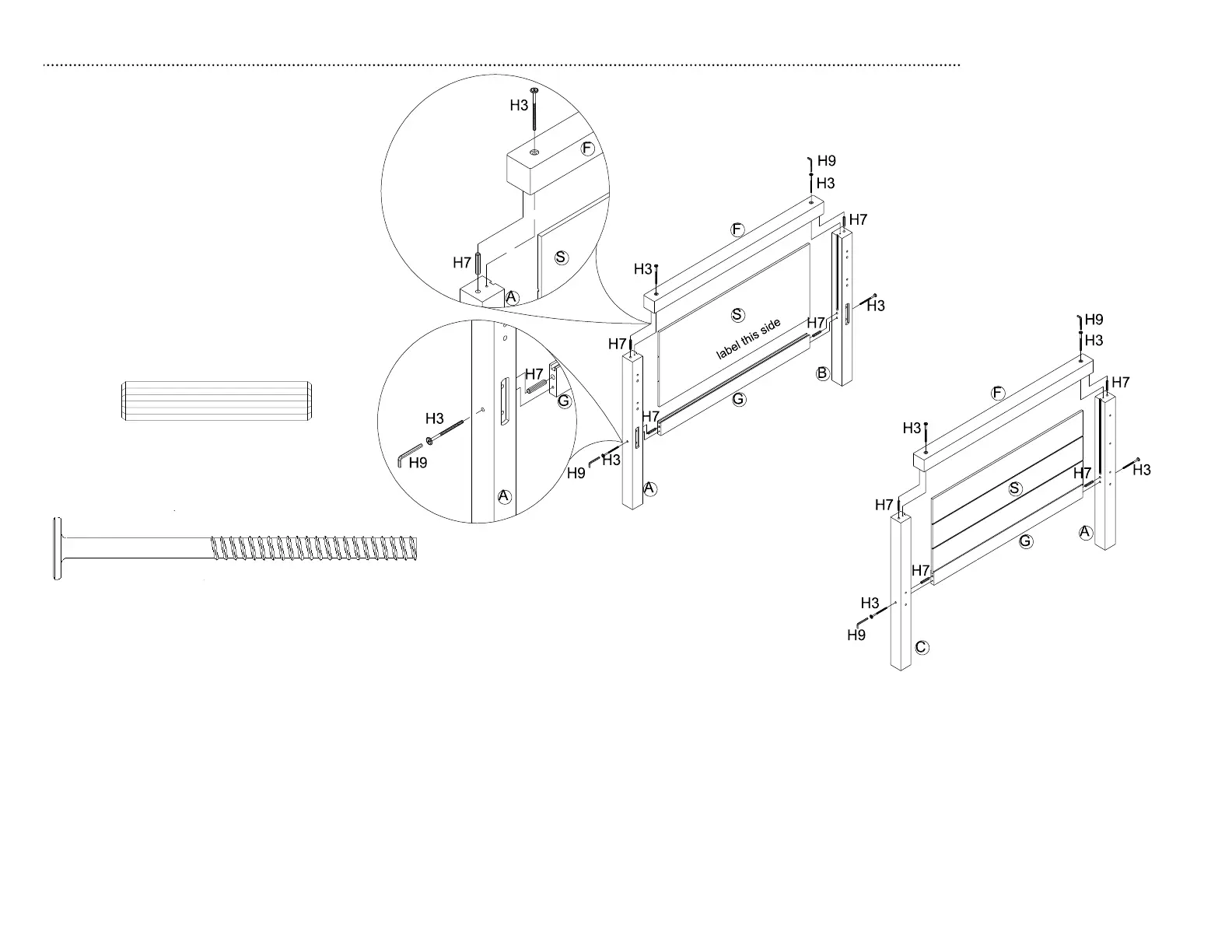 3. Attach the headboard top rail (F) to top posts (A & B) with wood joint connectors (H3) using allen key (H9).