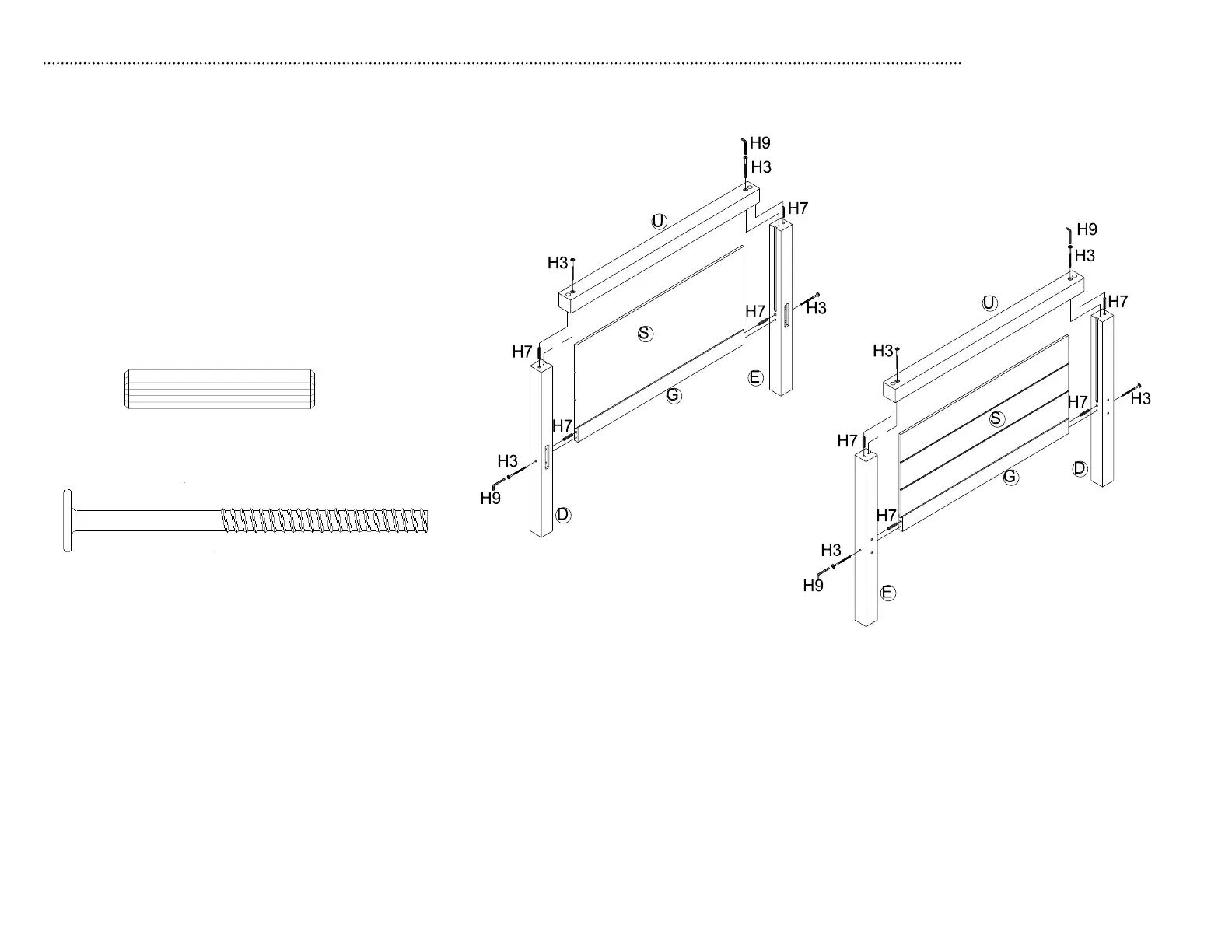 3. Attach bottom headboard top rail (U) to posts (D & E) with wood joint connectors (H3) using allen key (H9).