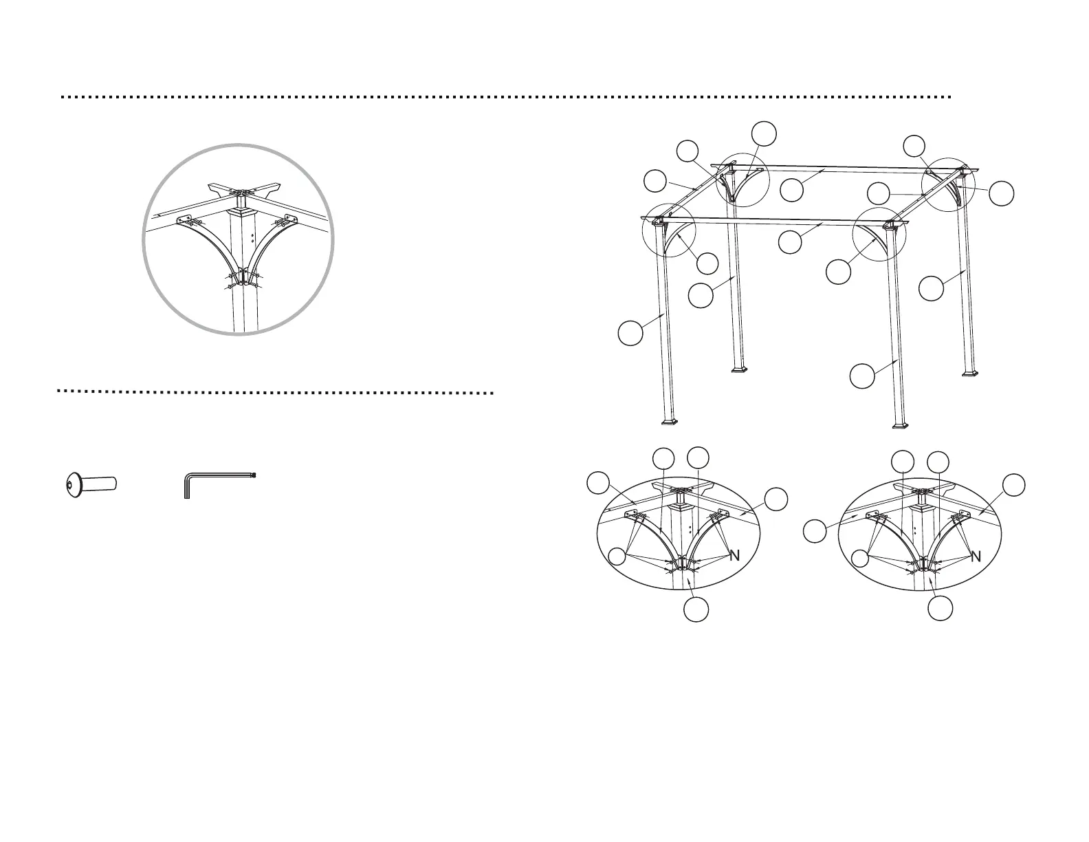 1. Attach the corner bracket1 & 2 (G1 & G2) to the post leg1 & 2 (A1 & A2)