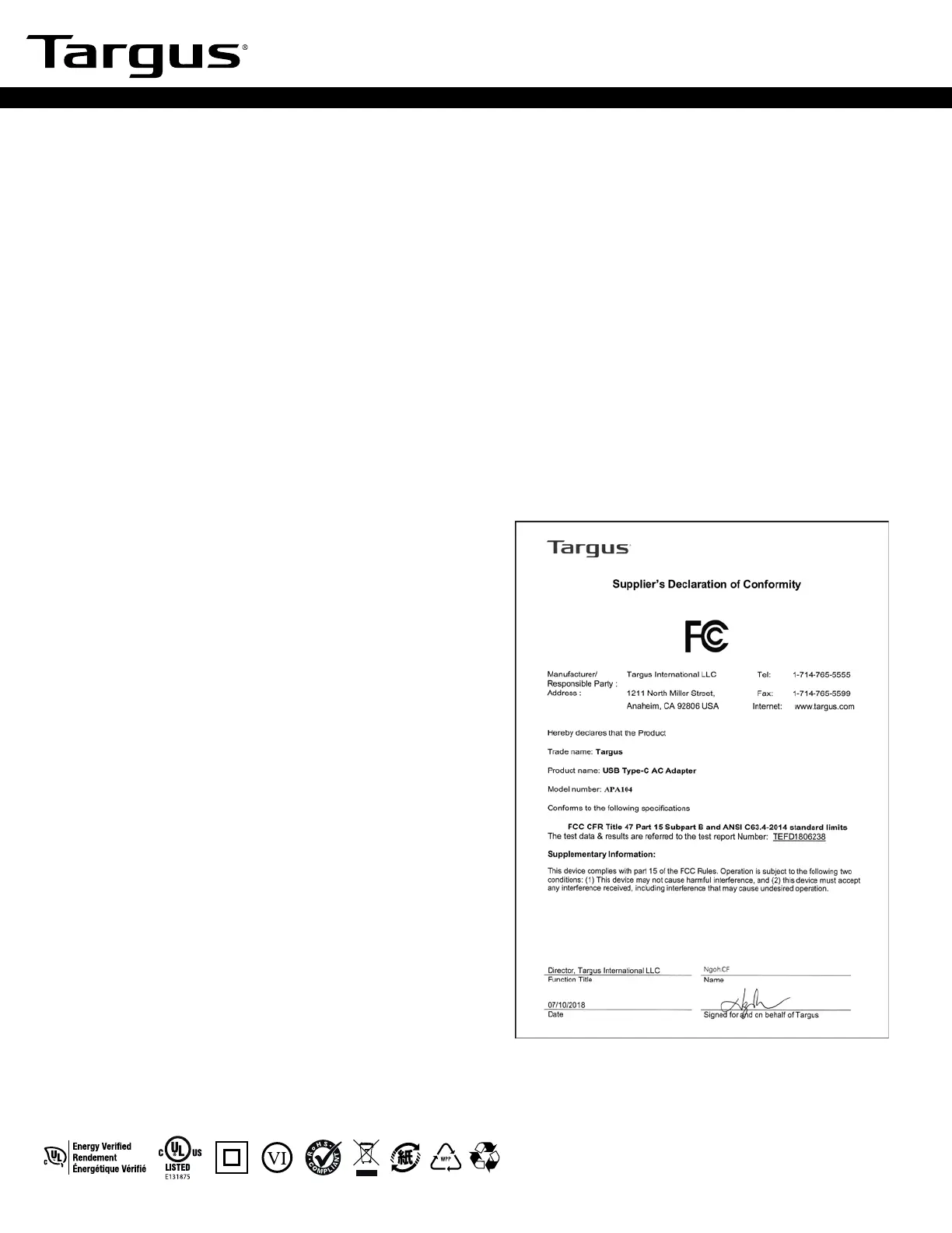 Changes or modications not authorized by Targus void the user’s authority to operate