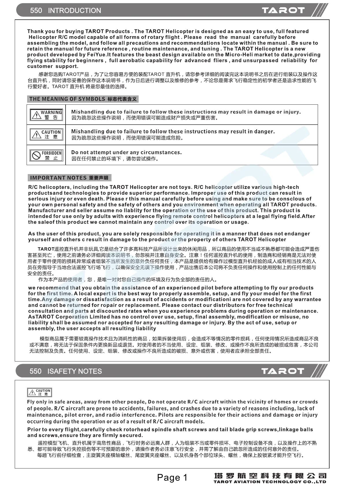 Tarot 550 - 550 Introduction; Symbol Meanings; Important Usage Notes; 550 Safety Notes