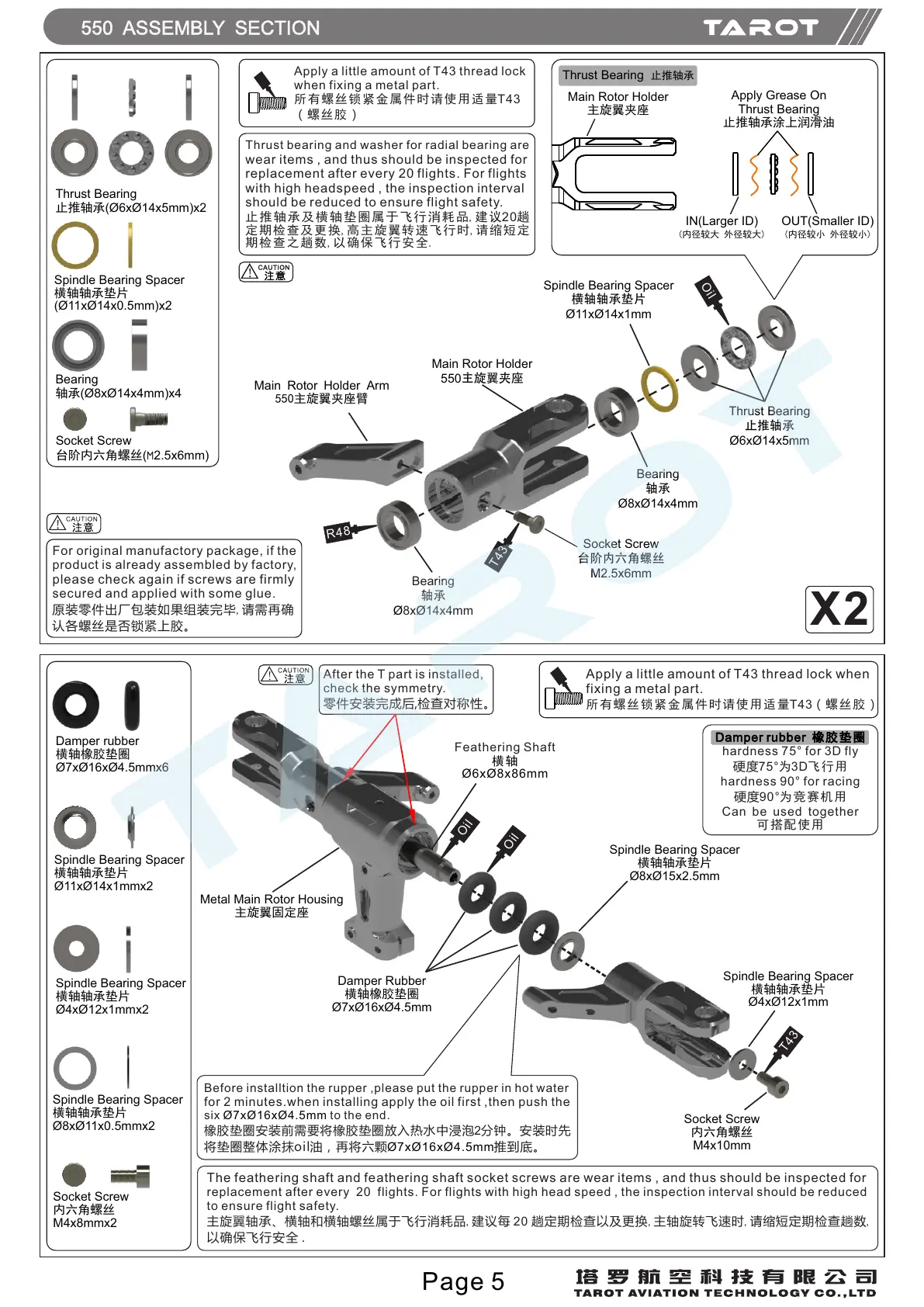 主旋翼轴承、横轴和横轴螺丝属于飞行消耗品,建议每 20 趟定期检查以及更换,主轴旋转飞速时,请缩短定期检查趟数,