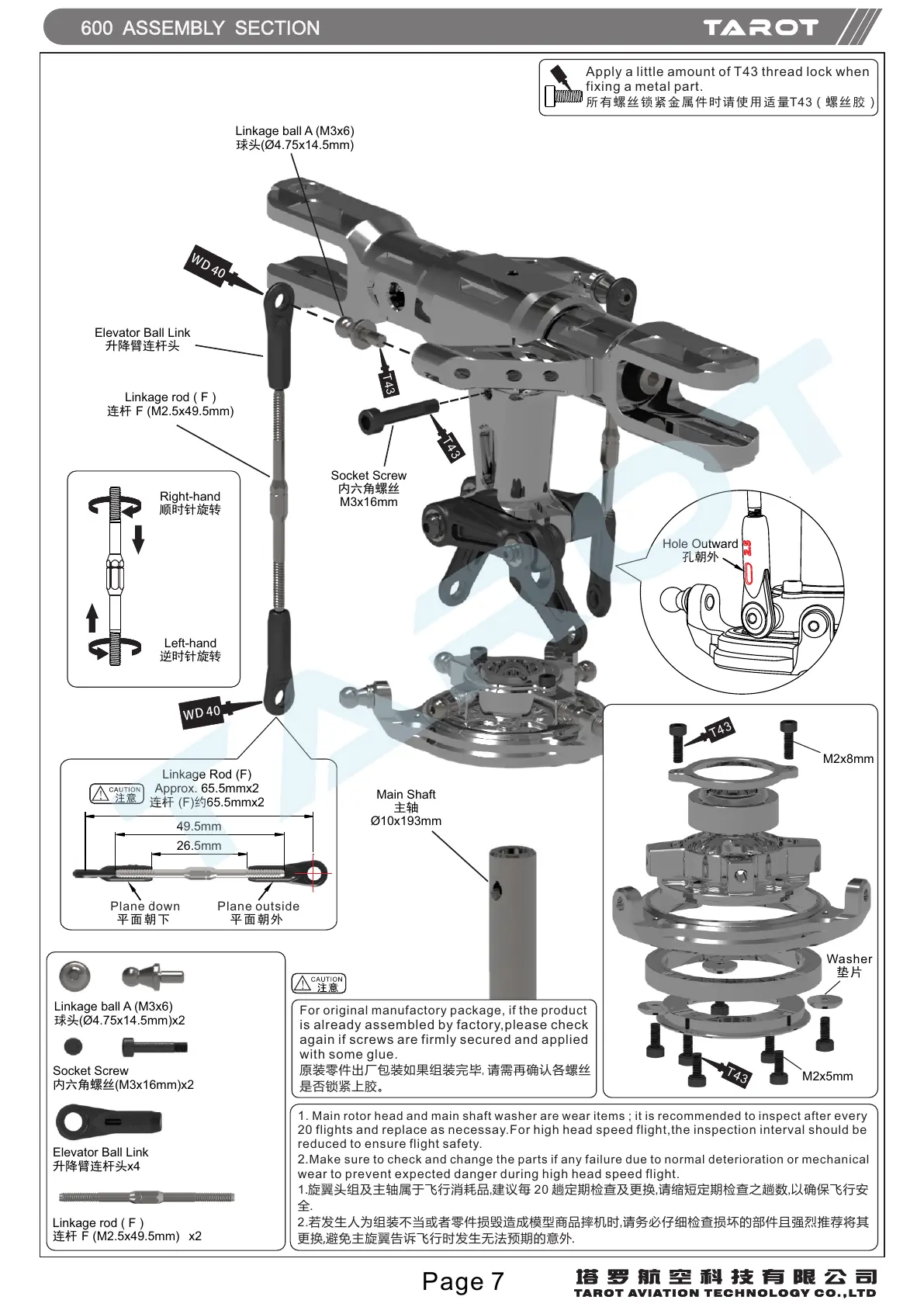 1. Main rotor head and main shaft washer are wear items ; it is recommended to inspect after every