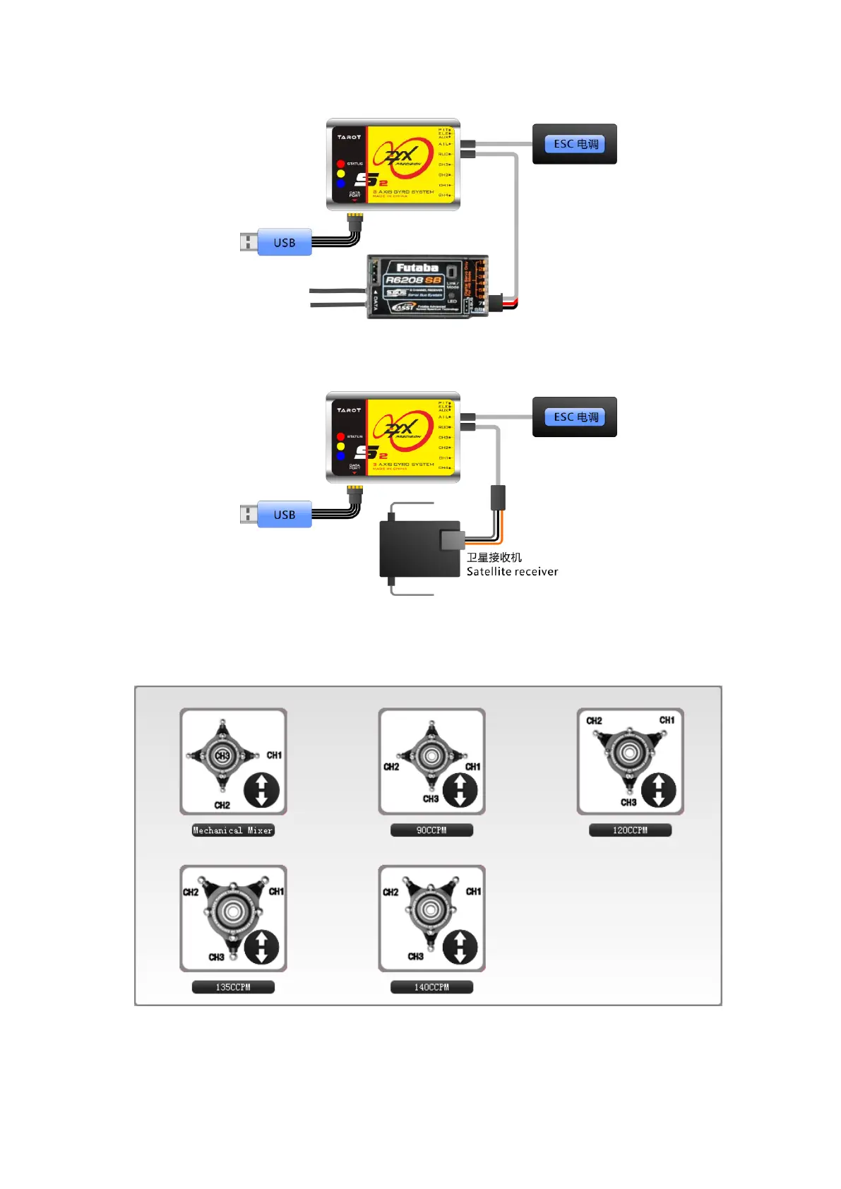 Connect the tail servo to CH4 and connect swashplate servos to CH1, CH2, CH3 according to the