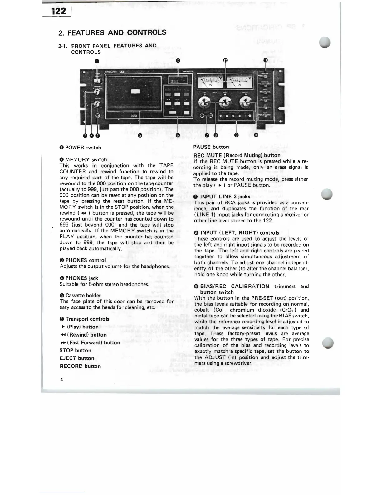 Tascam 122 - 2. Features and Controls; 2-1. Front Panel Features and Controls