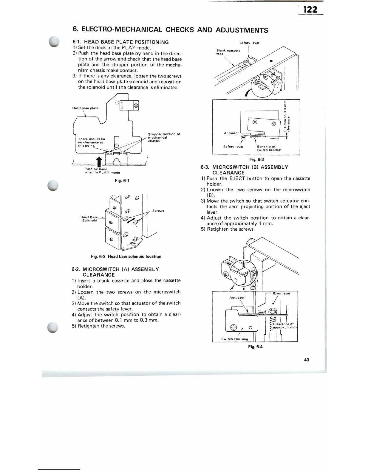 Tascam 122 - 6. Electro-Mechanical Checks and Adjustments; 6-1. Head Base Plate Positioning; 6-2. Microswitch (A) Assembly Clearance; 6-3. Microswitch (B) Assembly Clearance