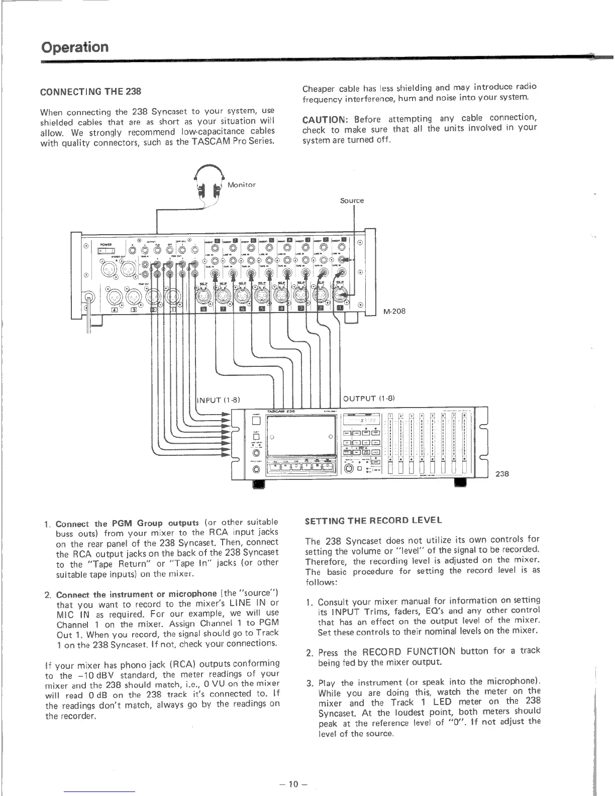 Tascam 238 - Operation Guide; Connecting the 238 Syncaset; Setting the Record Level
