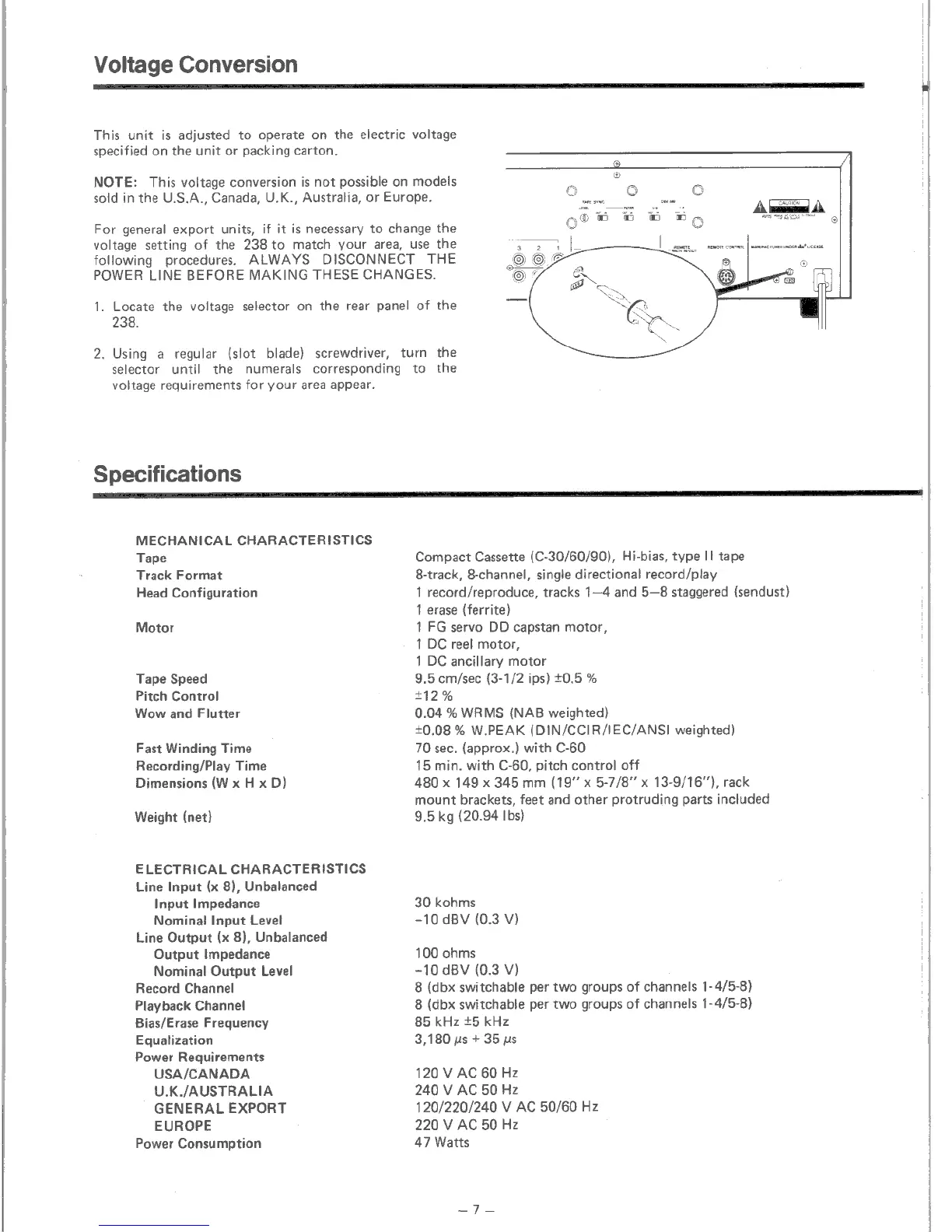 Tascam 238 - Voltage Conversion; Adjusting Power Settings; Specifications; Mechanical Characteristics