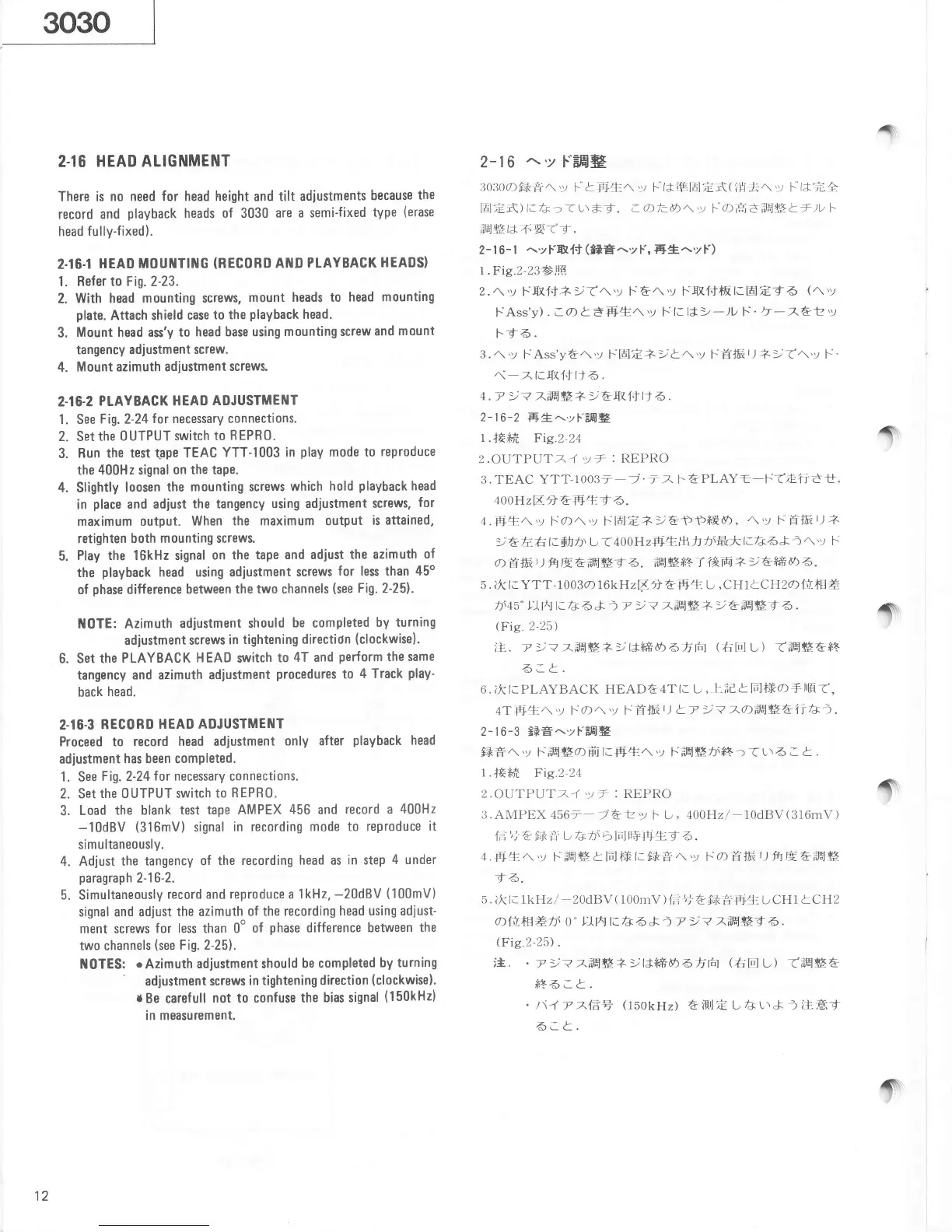 Tascam 3030 - 2-16 Head Alignment; 2-16-1 Head Mounting (Record and Playback Heads); 2-16-2 Playback Head Adjustment; 2-16-3 Record Head Adjustment