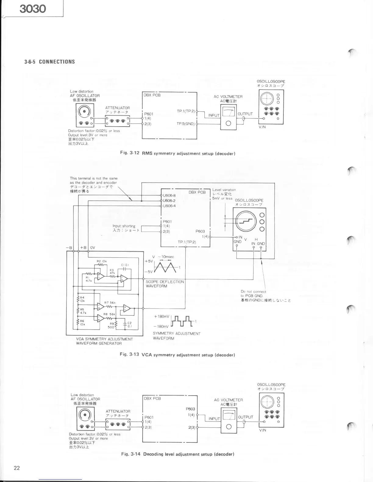 Tascam 3030 - Connections; RMS Symmetry Adjustment Setup; VCA Symmetry Adjustment Setup; Decoding Level Adjustment Setup