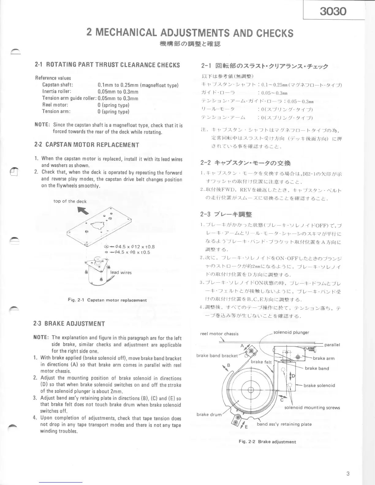 Tascam 3030 - 2 Mechanical Adjustments and Checks; 2-1 Rotating Part Thrust Clearance Checks; 2-2 Capstan Motor Replacement; 2-3 Brake Adjustment
